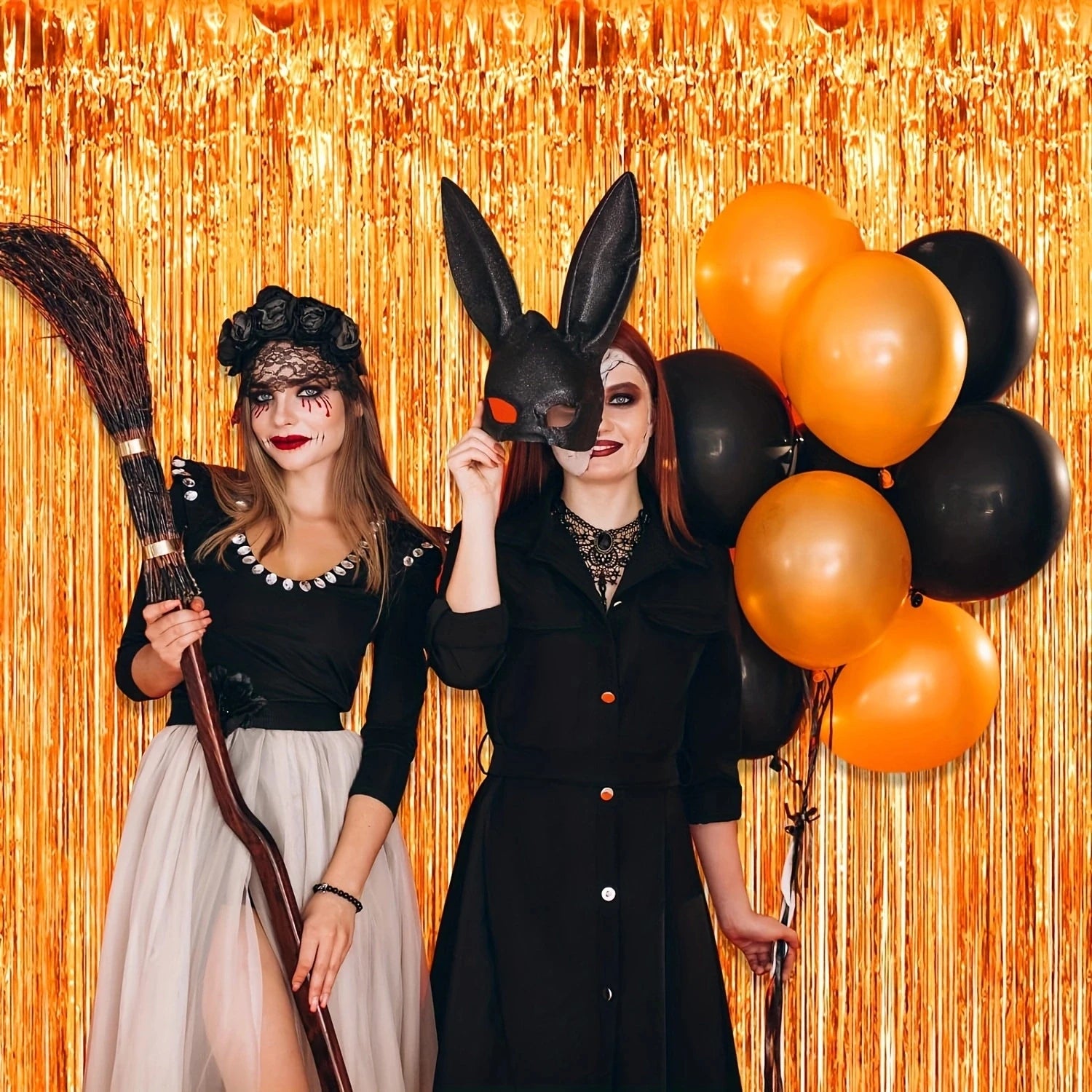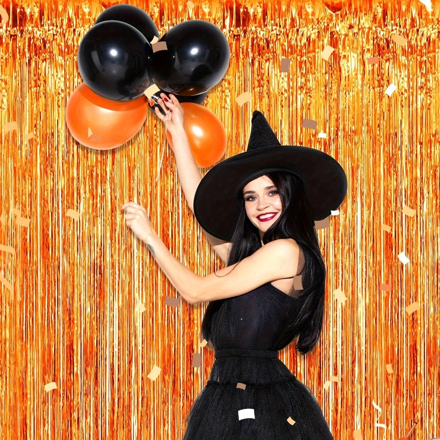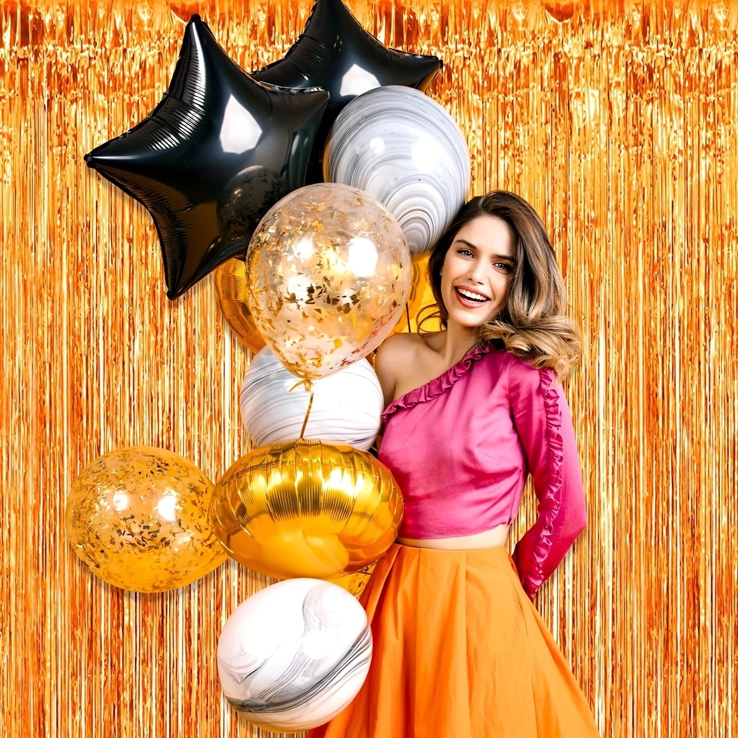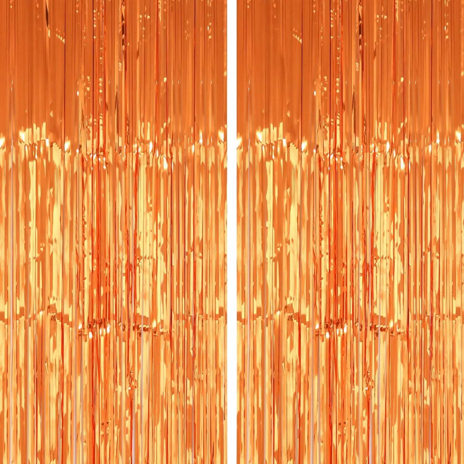 Ett set med två skimrande gardiner i metallicfolie med fransar. Perfekt som bakgrund till fest, bröllop, födelsedag eller högtider där du vill skapa en festlig och minnesvärd atmosfär. De livfulla orangea tonerna och det glansiga materialet gör dem till en blickfångande dekoration för både stora och små tillfällen.