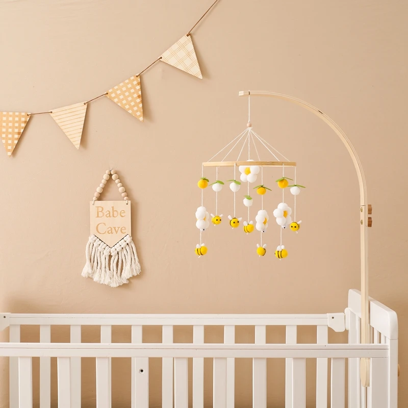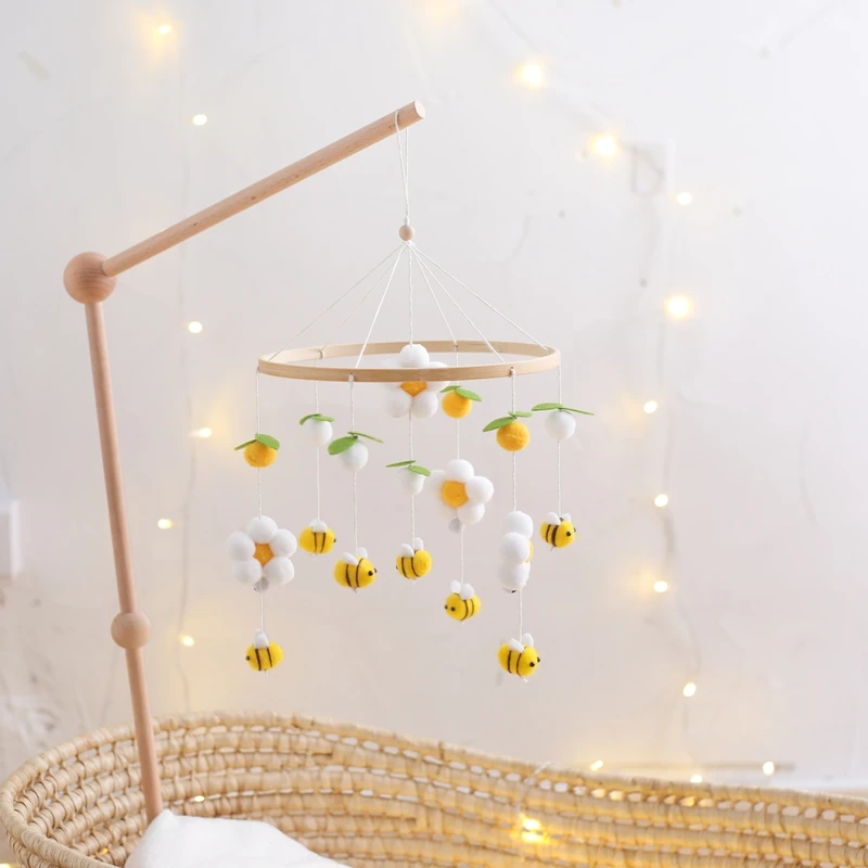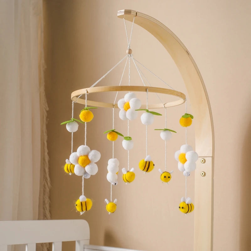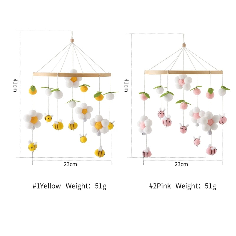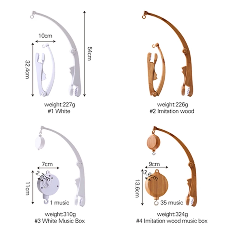 En fin och praktisk babymobil med hållare i plast med träliknande yta. Perfekt för spjälsäng eller barnvagn. Mobilen har mjuka, virkade hängande figurer i form av djur, regnbågar eller geometriska former som stimulerar barnets syn, hörsel och motorik. Inbyggda skallror och musikfunktion ger extra underhållning för barn 0–24 månader. Enkel att montera och passar de flesta spjälsängar.