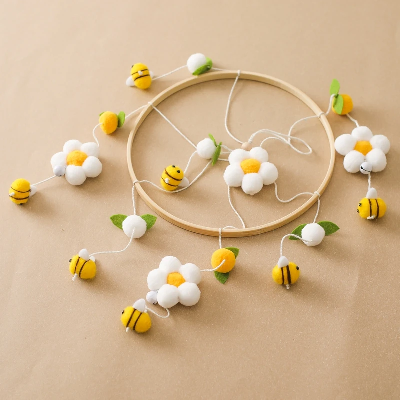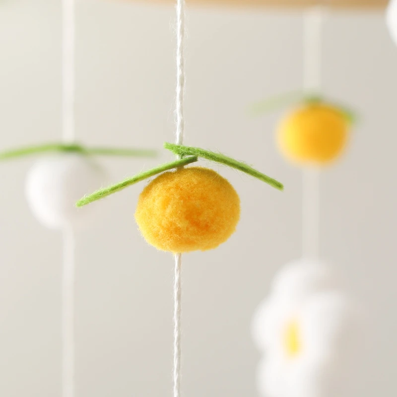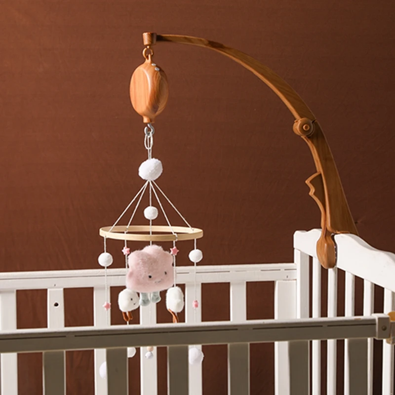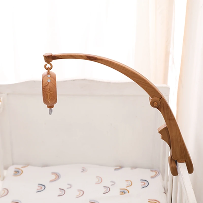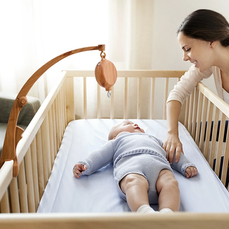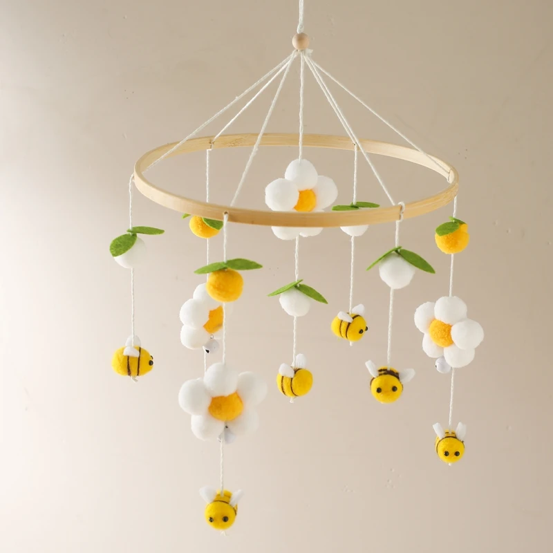 En fin och praktisk babymobil med hållare i plast med träliknande yta. Perfekt för spjälsäng eller barnvagn. Mobilen har mjuka, virkade hängande figurer i form av djur, regnbågar eller geometriska former som stimulerar barnets syn, hörsel och motorik. Inbyggda skallror och musikfunktion ger extra underhållning för barn 0–24 månader. Enkel att montera och passar de flesta spjälsängar.