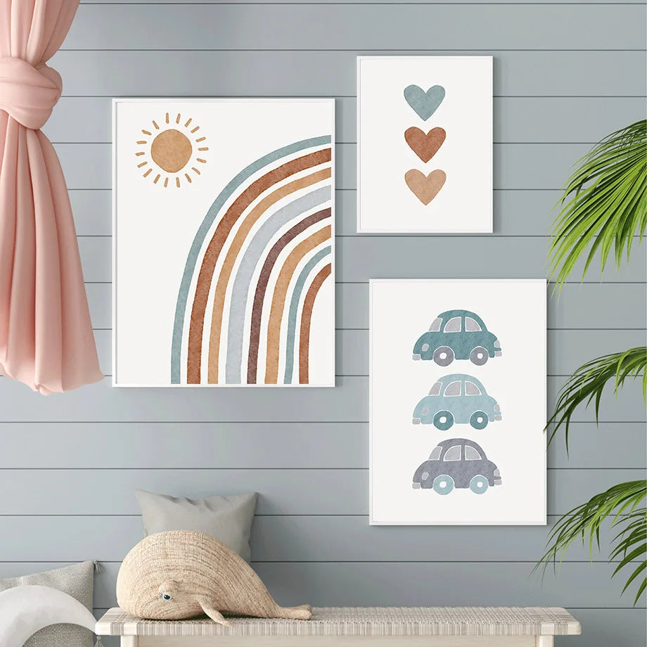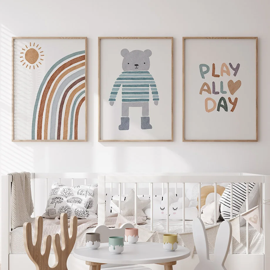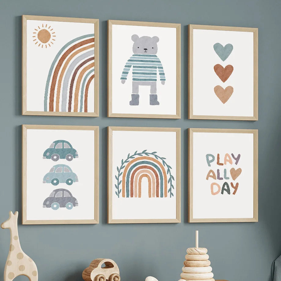 Färgglad och lekfull poster med boho-inspirerat motiv av björn, regnbåge, hjärta och sol. Perfekt för att skapa en varm och glad känsla i barnrummet. Tryckt på canvas med vattenfast bläck för lång hållbarhet och hög färgåtergivning.