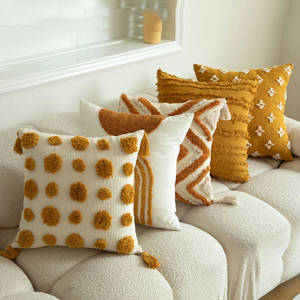 Skapa en varm och inbjudande känsla i hemmet med detta vackra kuddfodral i boho-stil. Med detaljerad jacquardbrodyr, dekorativa tofsar och geometriskt mönster blir det en charmig detalj i soffan, på sängen eller i favoritfåtöljen. Kuddfodralet är tillverkat i en mjuk och slitstark bomulls- och polyestermix, vilket gör det både skönt och hållbart.