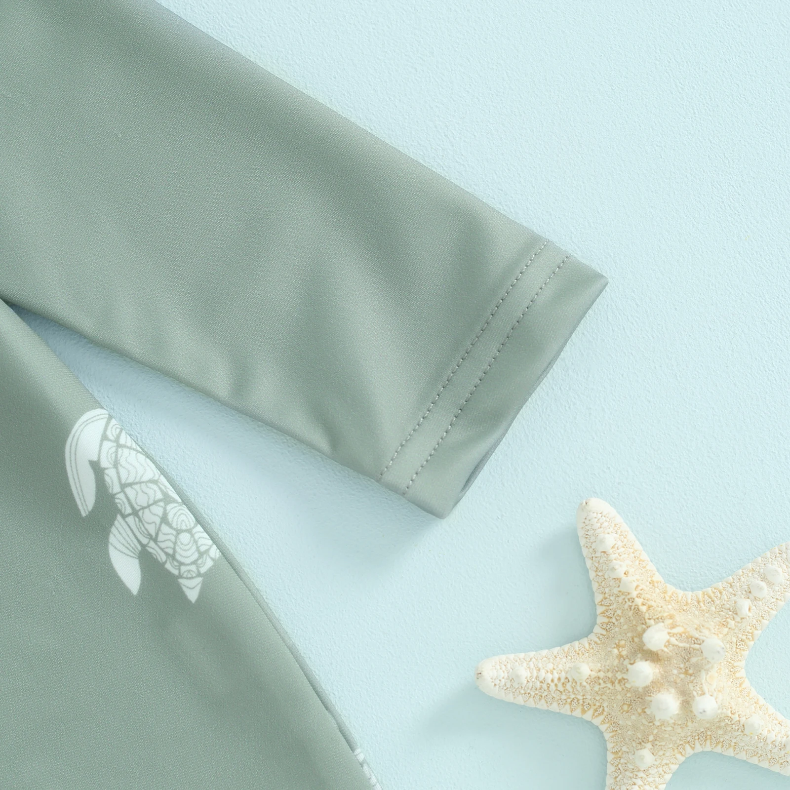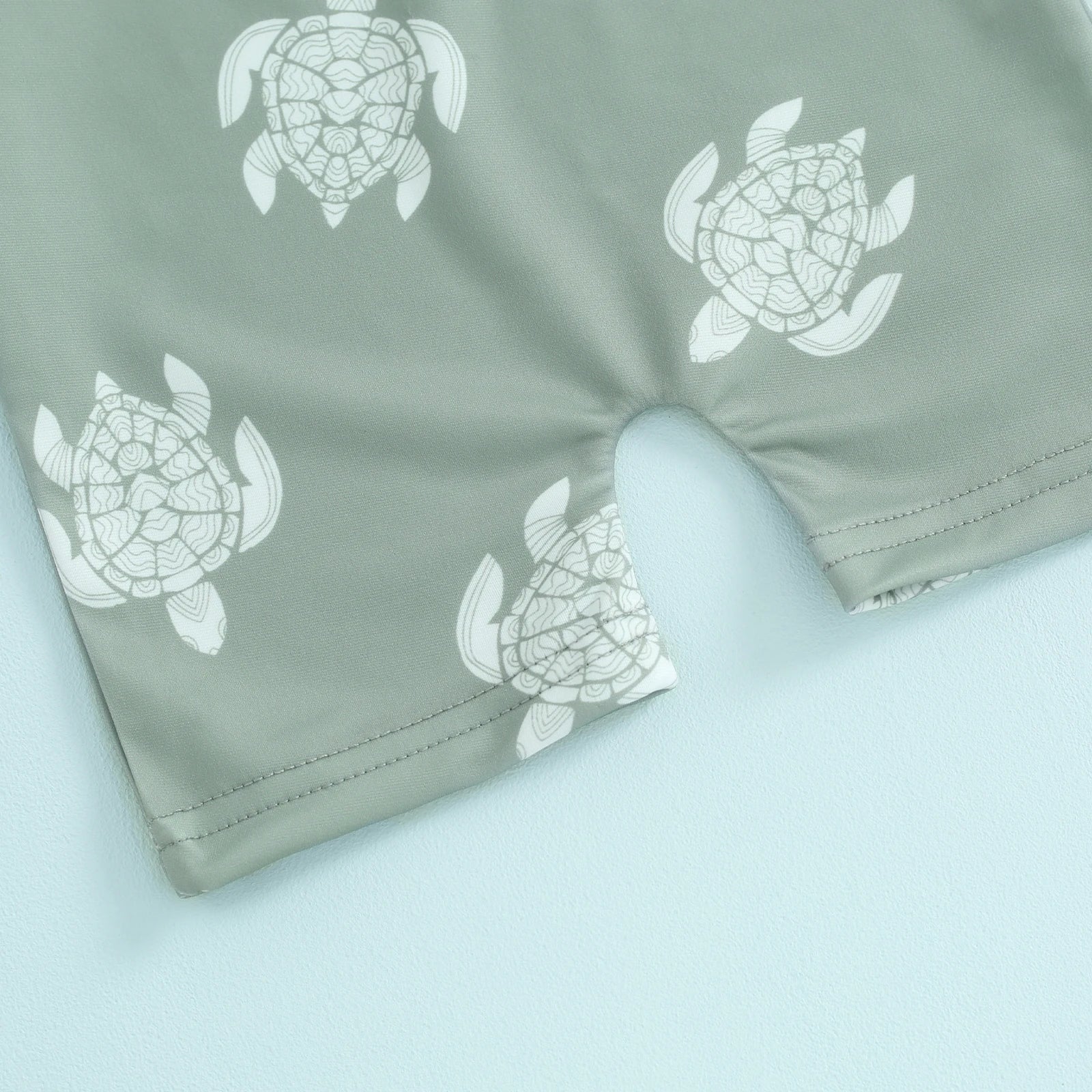 Skydda de minsta strandälskarna i sommar! Vårt söta och sportiga UV-badset för baby och toddler är både funktionellt och oemotståndligt med lång ärm, matchande solhatt och lekfulla tryck av sköldpaddor.