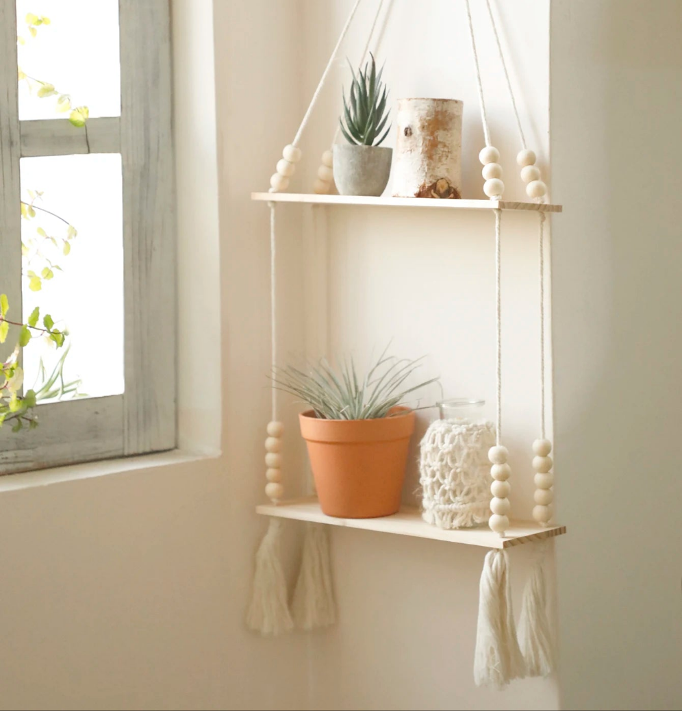 Skapa en naturlig och stilren känsla i sovrummet, vardagsrummet, badrummet eller köket med denna moderna vägg-hylla i rustikt trä och makramérep. Perfekt som hängande förvaringshylla eller blomsterställ. Idealisk för foton, krukväxter och dekorationer. En uppskattad present till Mors dag, Fars dag, vänner och familj. Enkel att hänga upp i hemmet, studentrummet eller lägenheten.