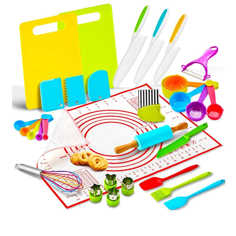 Upptäck glädjen i att laga mat tillsammans med barnen med detta stilrena och barnsäkra köksset. Setet innehåller barnvänliga knivar och ett skalverktyg i slitstark plast. Perfekt för små händer som vill vara med i köket. Med rundade kanter och ett ergonomiskt handtag får barnen möjlighet att skära frukt, grönsaker och kakor på ett tryggt och lärorikt sätt.