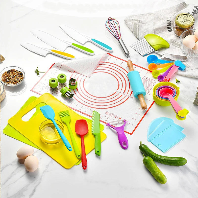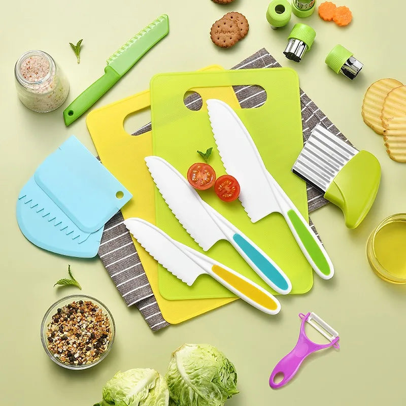 Knivarna är lätta, hållbara och fria från skadliga ämnen. De är utformade för att inte vara vassa, vilket gör dem säkra att använda under uppsikt. Ett utmärkt sätt att främja självständighet, motorik och intresse för matlagning hos barn från tidig ålder.